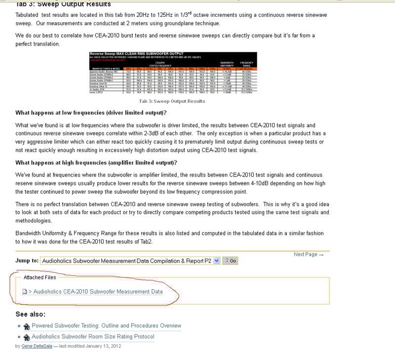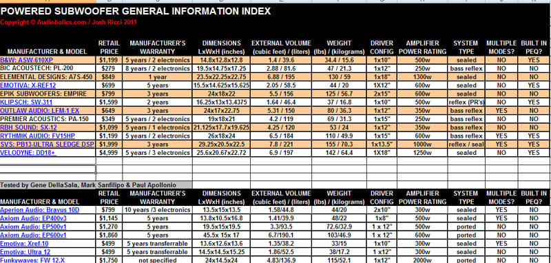 With each new subwoofer review published, we are now typically uploading an Excel spreadsheet of all subwoofers tested to that point.  This can be seen on the main page of this article and any recent subwoofer review towards the bottom of the site below the "Jump to" drop down bar.  You need Microsoft Excel to view it. If you have trouble finding the excel file, go to our forum thread and download the Zip file from the first post.  Also included on that thread is a PDF version of this spreadsheet for those that don't have Excel.