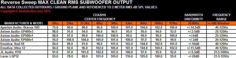 The top table shows results based on CEA-2010 testing conducted by Josh Ricci.  The bottom table shows results using reverse sinewave sweep testing by reviewers other than Josh Ricci.