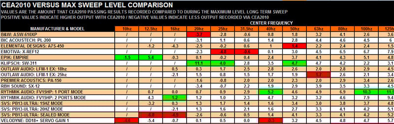 Tabulated  CEA 2010 test results are located in this tab from 10Hz to 125Hz in 1/3rd octave increments.  Our measurements are conducted at 2 meters using groundplane technique.  While the test program reports peak SPL data, we convert all of our data to RMS data at 2 meters which more closely resembles 1 meter 4pi (freespace).  Though it’s not as flattering to report 2 meter RMS data as it is to report 1 meter peak data to the manufacturers whose sole purpose may be a marketing slogan, we do this because it’s a more accurate way of representing actual product performance.