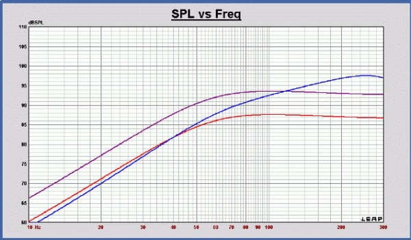 Working up a model (15” driver in totally enclosed box) in LEAP 5 (plots at right), we see the reference free-air curve in blue, ground plane @ 1 m in purple and the ground plane curve scaled to 2m (red). As expected, the ground-plane at 2m is nearly identical to the free-air plot at 1m. Clearly, the ground-plane approach is an excellent, cost-effective (if not outright free) alternative if you don’t happen to have handy an anechoic chamber or a 100’ tower.