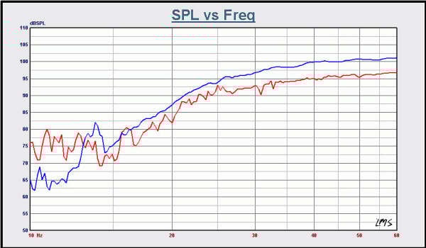 Don’t underestimate the latter’s measurement-corrupting capabilities: air or ground traffic or wind noise can easily mangle an otherwise good amplitude response measurement, as evident in the < 15 Hz portion of the blue and < 25 Hz portion of the red curves seen above . Depending on the nature of the background noise, redoing the measurements when all is quiet or averaging several measurements are effective antidotes.