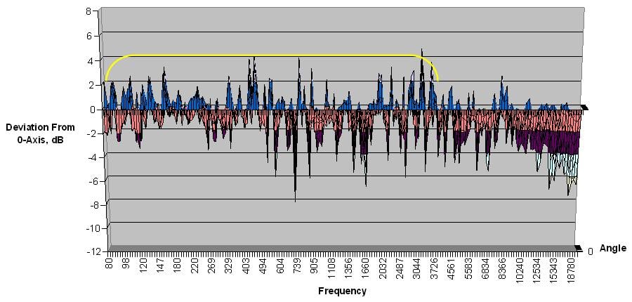 The 1/24 octave chart below shows a generally inaudible difference in the speaker’s response across various angles. The frequency range of the redundant drivers, from 80 to 350 Hz, is highlighted by the yellow bracket.