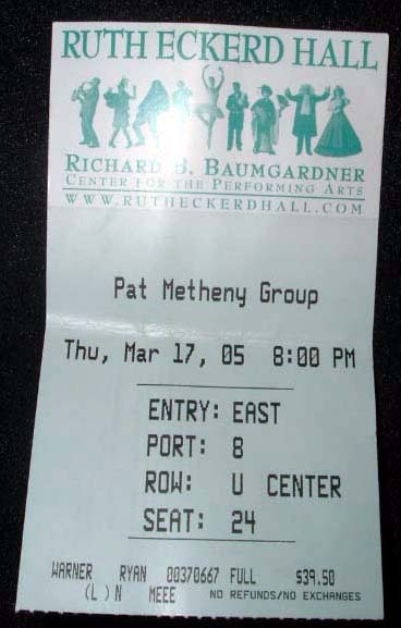 It's not often I go to see live concert performances. This is for a variety of reasons: they are usually too loud and crowded, and the bands rarely live up to my expectations or what I have come to cherish on their CD recordings. There are a few exceptions, of course. U2, Genesis, Yes, Steely Dan, Marillion, The Rippingtons, and last but NOT least, The Pat Metheny Group. This would be my fourth time attending a Pat Metheny Group World Tour, having twice seen him at one of the best local concert venues, Ruth Eckerd Hall in Clearwater Florida. For those of you not familiar with this Hall, let me tell you how cool it is. The acoustics are among the best I have ever heard for live performances, the seating is very good, and the parking is well organized with ample exits.