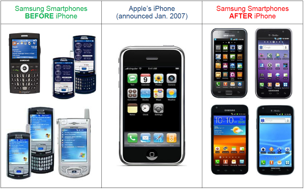 Apple dove into the phone market when phones were merely contact devices with cameras. The most advanced phones, for the most part, included colored icons and lists which were navigated by trackballs or menu control pads. They introduced the touch screen and an entire ecosystem of apps. It changed phones forever - just ask Samsung, who is being sued for allegedly shifting their entire phone direction based on the iPhone's innovations and copying their design. We won't comment on whether those allegations are true (because we don't know). But here's a nice picture for you to enjoy: