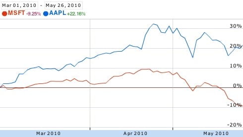 To give you an idea of the incredible growth of this company, largely due to the iPod and iPhone and Apple's commitment to be a value and leader in the laptop segment, shares of Apple are worth more than 10 times what they were a decade ago. Apple hasn't had a higher market value than Microsoft since 1989. Just for reference, that predates both Windows 3.1 and Mac System 7 (remember back that far?) Color monitors weren't in most users homes and if you had a Mac it was likely a Macintosh II or Macintosh Plus.