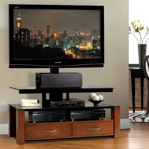 With overall dimensions of 47-1/2” W x 58” H x 22” D, it will accommodate most flat panel TV’s up to 55” or 125lb and at least 4 audio/video components. The rear universal swivel mounting system allows a TV to be suspended above the stand or removed to display the TV on a 3-shelf stand-alone table. The third option lets the swivel mounting system be hung on the wall. Design elements include two drawer media or other storage in a rich caramel finished wood cabinet, plus black tempered safety glass shelves and black scratch resistant powder-coated metal frame. The TPC-361 will be available in Spring 2010 with a suggested retail of $499.99.