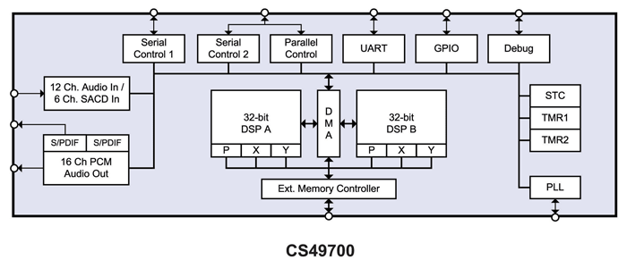 With its 32-bit, dual-core structure, the CS49700 generates true parallel processing power of 1.8 giga operations per second (300 million instructions per second). Multiple audio formats also present myriad clock frequency challenges, to which the CS49700 adeptly manages via an advanced phase-lock-loop (PLL) that generates a system clock source.