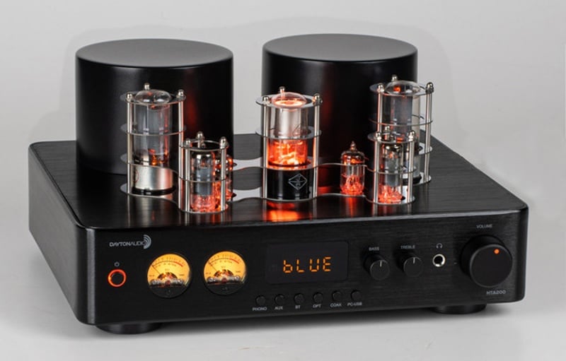 The HTA20 is a tiny thing, measuring just 6.5 by 11 by 8.5 inches, and weighing a mere 5.7 pounds. Packed inside its compact chassis, you’ll find a preamp with “amber-toned (vacuum) tubes that provide a warm sound” and a Class A/B power amplifier rated to deliver 20 watts per channel at 4 ohms. (An 8-ohm rating is not specified.) Designed for smaller spaces and/or highly sensitive loudspeakers, the HTA20 is “perfect for college dorms or bedrooms,” according to Dayton Audio. For such an affordable piece, the HTA20 has a number of useful features, including a built-in USB DAC (though it maxes out at 16-bit/48kHz), two analog inputs, a subwoofer output, a headphone jack for private listening, and Bluetooth 5.0 for streaming audio from a smartphone or tablet.