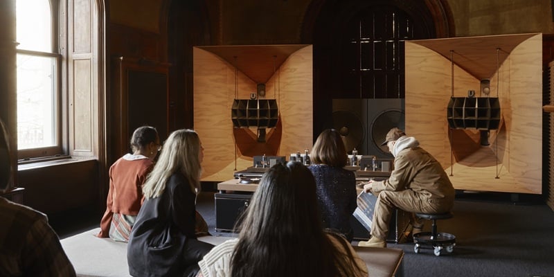 19, 2026. The installation features a large-scale, handmade audio system