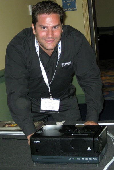 Epson’s MovieMate 55 portable projector demonstrated at this year’s Audioholics State of the Union conference may not have the bragging rights of the big boys of home theater systems, like 1080p high definition images, but it can promise you one thing: it will make you cool.