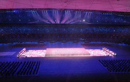 The LED screen that measured 482 feet long and 72 feet wide was laid on the ground of the stadium bejeweled with some 44,000 LED beads each with a distance of about 2 feet (600 mm) between each two beads. More LED beads were embedded into the costumes of the show’s performers. It created a stunning effect as the performers fanned out creating falling star filled sky within the National Stadium. All the while electronic monitoring systems kept track of over 18,000 performers using ID codes.