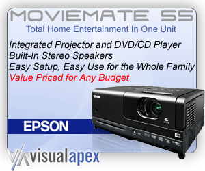 The MovieMate 55, offered for the unheard of price of $699, is all about taking home theater on the move. Weighing only 8.3 lbs it comes in a convenient and very mobile cube shaped form-factor allowing it to project from nearly any flat surface. It has two built-in 8W speakers that offer Dolby Digital / DTS 5.1. It can project a 16:9 widescreen 120-inch image from only 12 feet away or 60-inch from just 6 feet away.