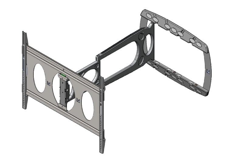 Next up was the Premier Mounts “lowPRO ” wall mount. This mount is a swing arm mount that offers 3 placement options. That means your mount can attach and swing from the left, right or center. Having installed several of these types of mounts, that is a lifesaver when you are attempting to center a TV on the wall, yet have to deal with locating non-centered studs to secure the mount. Because it has three hinge points, the swing-out mount arm extends a full 30” from the wall. Hit two studs or anchor your mounts into concrete or block and you can safely hang a fairly heavy TV on the mount. What's funny is that Premier has yet to rate the mount for maximum weight or TV size. On top of giving you up to 30" of extension and left/right movement, the new lowPRO has 15 degrees of maximum downward tilt. When retracted, the aluminum mount sticks out a little less than 1-1/2" from the wall. For cable management, there are channels built right into the arms, so your installation should be nice and tidy, provided you aren't using gargantuan HDMI cables.