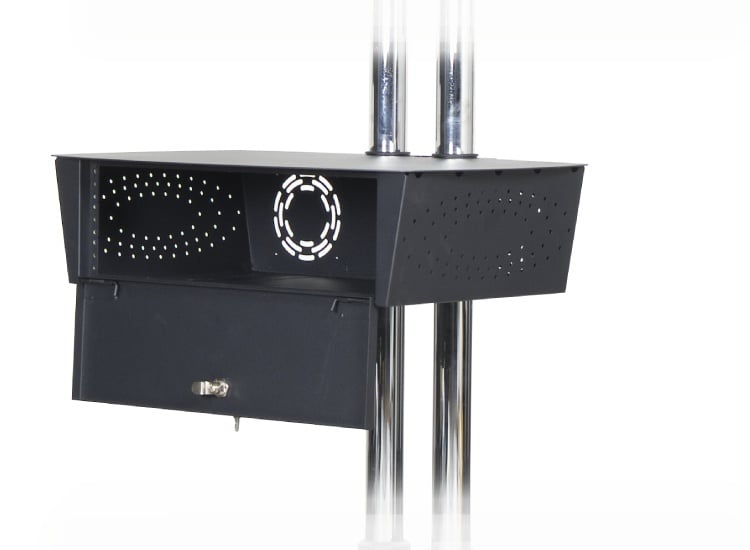 The last product they announced was their new Secure GearBox Shelf (PSD-GBSHLF). This is a storage box with a flat "shelf" top that will fit all of Premier Mounts' dual-pole carts & stands. The PSD-GBSHLF GearBox can be placed at any height along the dual-pole stand. It's designed to give installers and rental houses a place to securely place equipment such as source components and other A/V accessories safely in place where they can be locked away and protected. The storage area actually has integrated rack rails that are 3U high, so you can mount pro gear and keep it even more stable within the locked compartment (ventilation holes are located along the sides as well - and there is a CUS-FAN optional rear fan). The entire size of the unit is 5.35” high x17.88” wide x 12.29” deep. The downward-opening door is removable and there are 3 key options.