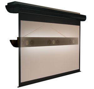 A less expensive passive, or slot, version is also available. The screen deploys and retracts through a slot in the in-ceiling box. The screen batten fills the slot when the screen is completely retracted.