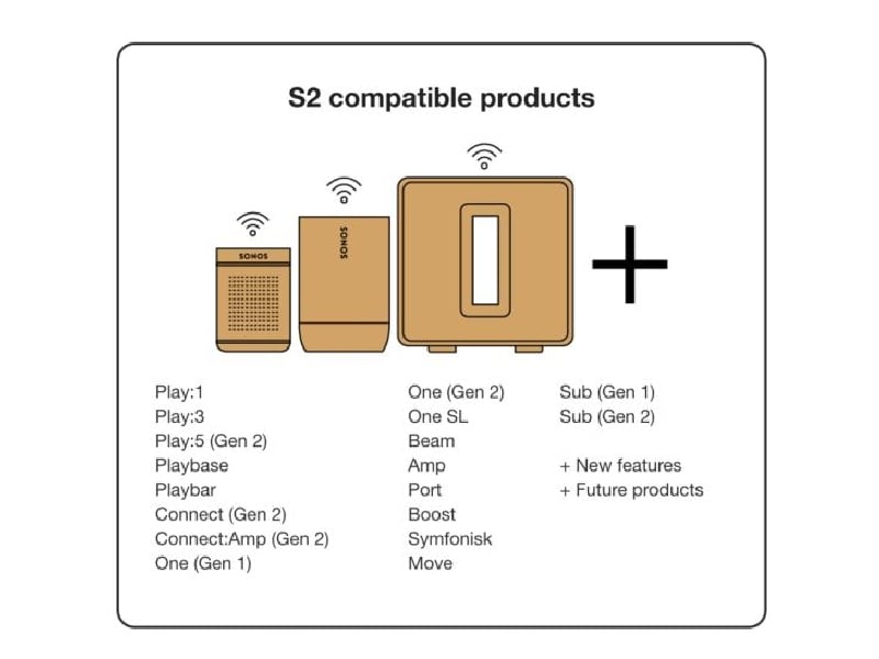 Almost all of Sonos's existing products are compatible with the new S2 platform, including: