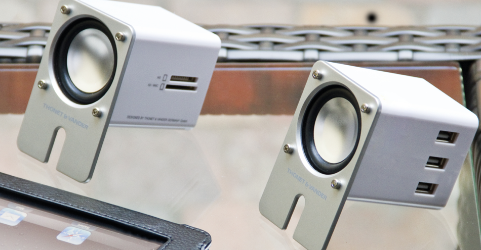 The multimedia offerings from Thonet & Vander take the typical form factor of a central bass module paired with a couple of satellite speakers. While we normally think of these sort of setups being used exclusively in an office setting, Thonet & Vander often have them placed (based on their pictures) in a living room. This is a fairly interesting spin on these sorts of speakers and will probably appeal to a number of consumers. Secondly, they have USB Sound offerings which are more directed toward an office environment. These take the form of mini-bookshelf speakers to 2.1 systems to very tiny satellites. The Akut speakers in particular caught our eye. They feature a single driver design with an integrated stand that props the front of the speaker up for desk placement. You connect to the speaker via USB (obviously) in the back but it doesn't stop there. On the side of one of the speakers are three additional USB ports and the other has three different sizes of SD card slots. For students, these speakers look like they'd be perfect.