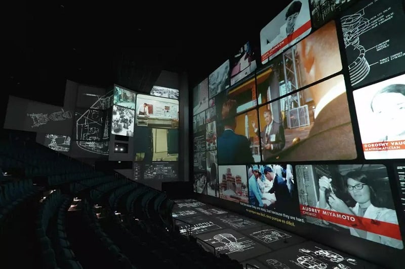 In order to bring the film to Houston, the Space Center had to carry out a massive renovation of its 500-seat IMAX theater. A custom-built 215-foot wraparound screen was installed, along with new high-resolution projection and cinematic surround sound. The upgrades to the theater will enhance the viewing experience of future content as well, but they were a requirement for recreating the original UK production. Lightroom recommended Quince Imaging as its preferred North American service partner, so the company was contracted by Space Center Houston to design and install a projection and audio system that could transform the large-format theater into an immersive venue without sacrificing its ability to host traditional screenings and live events. Quince Imaging, which specializes in projection mapping and immersive content, installed five Panasonic PTRQ-35KU and two PTRQ-25KU projectors to deliver visuals with a total resolution of 60 million pixels. The meticulously-engineered installation uses a custom-designed, seven-channel automatic calibration system, which reportedly ensures perfect alignment of all images, and five Qlab media servers to deliver the high-resolution content. In order to replicate the scale and power of a rocket launch, Quince Imaging’s lead engineer, Keith Price, designed a specialized subwoofer array using JBL VTX B28 subs, each with dual 18-inch drivers. The array is reportedly capable of delivering a staggering 141dB of output across its operating bandwidth of 20Hz to 80Hz, helping to fully realize the work of sound designer Tom Hackley.