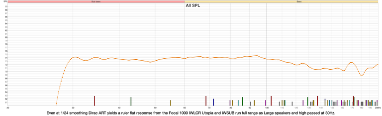 Impressive! Even at 1/24 smoothing Dirac ART yields a nearly "ruler flat" response from the Focal 1000 IWLCR Utopia and 2x IWSUB run full range as "Large" speakers and high passed at 30Hz.