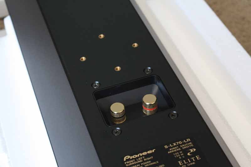 The center channel speaker is identical in every way to the LR front speakers with two notable differences. One difference is that the LR speakers have the word “Elite” inscribed near the bottom of the face on the glassy trim and the center speaker does not have the Elite symbol anywhere on its front. The wave guide for the tweeter directs the highs upward when the speaker is mounted below the TV. If you plan on mounting S-LX70 C above your television, be sure it is positioned with the rear label upside down to direct the high frequencies downward.