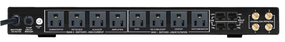 The back of the unit, in addition to the 8 AC outlets, has provision for filtering Ethernet (RJ45) and phone line (RJ11) cables as well as two separate coaxial cable feeds. The coax cable protection has a bandwidth of 0-2.2GHz so it should be compatible with all current digital cable and satellite TV services as well as all over-the-air antenna inputs.