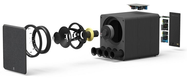 Just gazing into the face of this huge ported sub is to stare at a beast that you know will deliver Fifth Element-levels of “Big Badda-Boom!” Its 16-inch, 2-layer long fiber pulp/fiberglass cone is backed-up by a CNC milled low-carbon steel motor that our review describes as large enough to easily throw around its large cone, along with the cone’s surround that lets it punch well above its 16-inches. It’s powered by an 2000 Watt-rms amplifier that includes a range of filters and DSP settings. Our review concludes that the Monolith 16" delivers on its promise of extremely high output, low distortion and excellent time-domain behavior with solid extension all the way down to a chest-rumbling 16Hz. To borrow our review’s polite understatement: “ The Monolith 16" THX sub is certified per our Extreme Bassaholic Room Size Rating good for >5,000 ft^3 rooms. This is one heck of a sub!”
