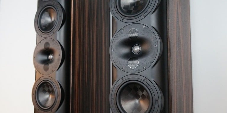 The S7ts are impressive to behold, a blend of elegance and science fiction with dark hard-wood finish enveloping a symmetrical esthetic. Standing at just over 4-feet tall, they may not be the largest tower speakers we’ve seen, but the front-facing, 5-driver array can be described as awe-inspiring. According to James’ review of Perlisten S7t speakers specialize at wide horizontal dispersion of sound to maximize optimal listening-space, a requirement for playing inside large spaces.
