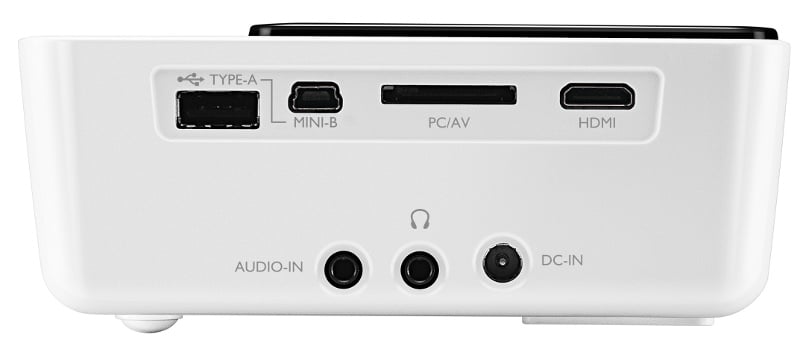The GP1 had all the connections (such as they were) on the back. There wasn't much there except USB and a breakout cable that handled your composite/RCA audio or VGA. This meant that if you wanted to take full advantage of the 720p capabilities of the GP1, you had to connect a computer to it. No longer. The BenQ Joybee GP2 has USB, Mini-USB, the PC/AV breakout cable, 3.5mm stereo audio in, SD Card, and (most importantly) an HDMI connection. This is a massive improvement over the GP1 and will make this projector much more flexible and useful in a much wider selection of situations. In fact, the VGA input is completely obsoleted because the Joybee GP2 can be connected to your computer via USB - a smart and convenient solution.