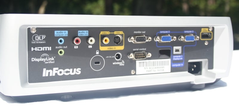 The back of the unit has a number of different inputs and outputs. There are 3.5mm jacks for both audio in and out, composite, S-video, and HDMI inputs, stereo RCA inputs, two VGA computer inputs, a VGA monitor output, an RS-232 port for automation, and a USB "DisplayLink" port. While most of these are self explanatory, the DisplayLink is a bit different. The way this works is you can connect any (recent) Mac or PC to the projector via USB and get both video and audio without having to load in drivers. You'll need Windows XP SP2 or Vista or MAC OS 10.3 (Tiger) or better with a USB 2.0 port. The interesting part is that you can get a DisplayLink Extender which uses Ethernet to extend the range up to 330 feet. Using the DisplayLink technology, you can run up to 6 projectors off of one computer which is, frankly, awesome. All I need now is for InFocus to send me 5 more projectors to test this out with. And if we could set that part of the review up to coincide with the Super Bowl, that'd be great.