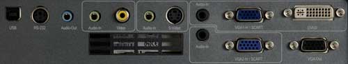 I/O connectors: DVI-D with HDCP, Dual VGA (YPbPr/RGB/SCART), S-video, Composite video (RCA), four audio inputs, USB, RS-232, VGA out, AC power