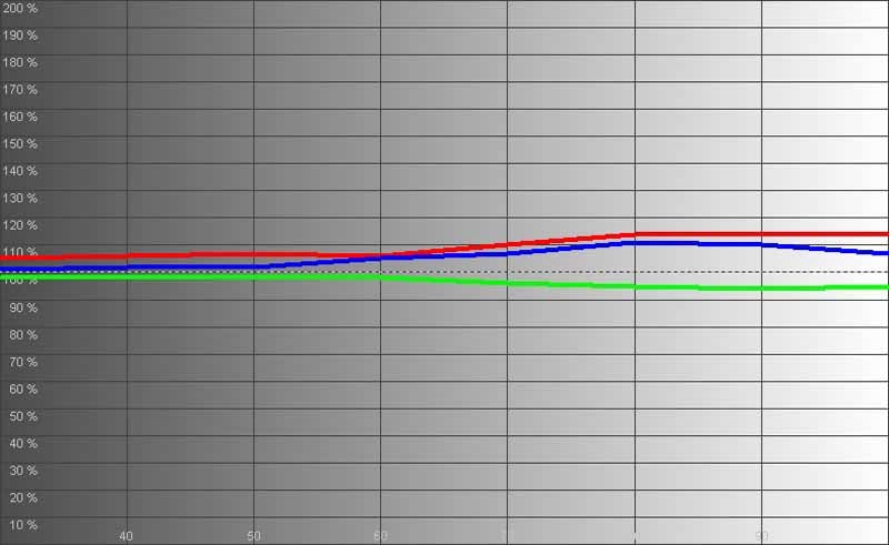 Here you see that we measured a not-bad-at-all grayscale from 30 to 80 IRE. Color temperature was excellent once we adjusted the setting and was more linear than many more expensive displays I've encountered this year. The Gamma measurement came in at 2.21 - which is about perfect, unless you prefer a slightly brighter picture.