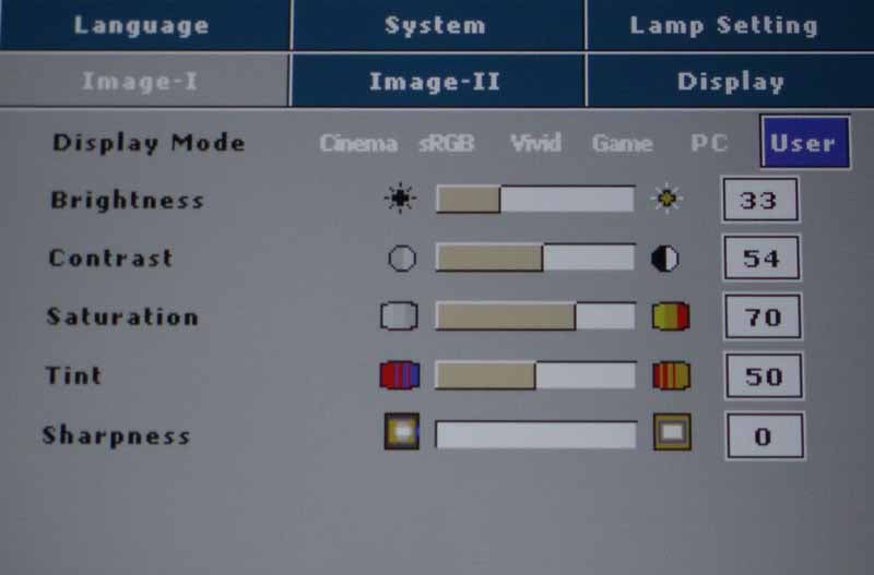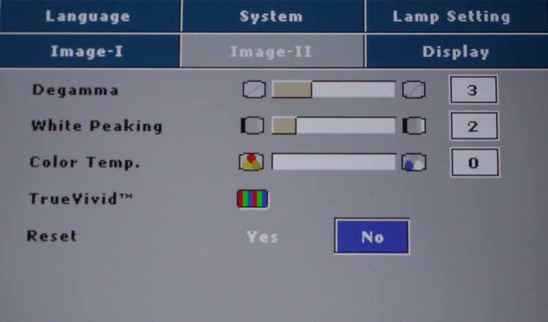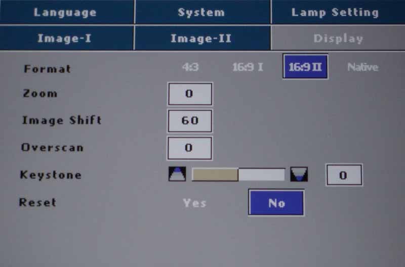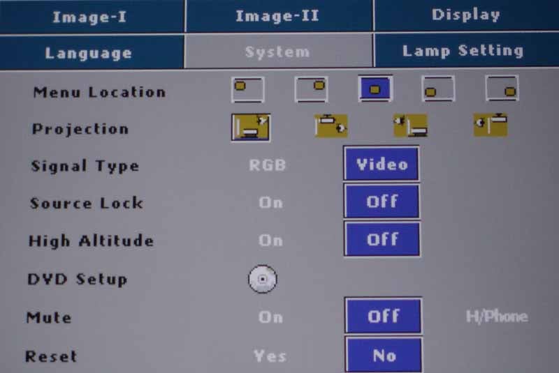 DV11-menu-image1.jpgThis menu system is where most people will start and it's where you'll select the Display Mode for the projector. If you are looking to crank out as much light as possible, engage "Vivid" or "PC" mode. For home theater use we recommend the Cinema mode. Once you make any adjustments in the Image-I or Image-II menus, the Mode will change to User. After selecting the proper mode, you'll want to use a setup disc Like Avia or Digital Video Essentials to calibrate the white and black levels. If you don't have one of these discs, look for a DVD with the THX logo on it and run the DVD Optimizer program that is always accessible from the DVD menu.