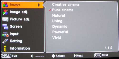 Living mode, though it appears to be very similar to Natural mode differs in that it adjusts the color temperature for a cooler presentation and at the same time, boosts reds and saturation. It also opens up the lens and lamp irises all the way. The result was not very pleasing to my eye, though some may find it helpful for a more colorful representation of on-screen elements.