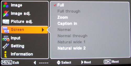 settings available on the PLV-Z4. Several of them are even quite useful. I found myself parked mostly on'Full'which is the proper setting for anamorphic DVDs and 4:3 content you want stretched to