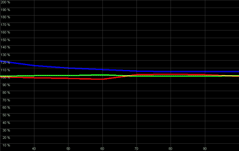 When the unit is stepped through levels of grey from 0 IRE to 100 IRE, the measurements hold a rather uniform luminance histogram.