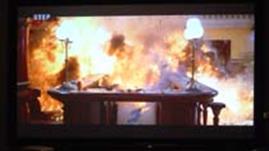I hope these images can capture a small amount of the detail that is visible on the screen. The color richness and levels of black that can be seen in this movie is amazing. Yamaha's Cinema Black mode is by far the best setting to use when you are trying to get the most out of the LPX-510 projector. If you look closely at the close up of Bruce Willis you can really see the detail of his eyelashes and the subtle textures of his skin. In the 5 megapixel master shots you can zoom in all the way and simply not see any pixel breakup in the images, including the explosion.