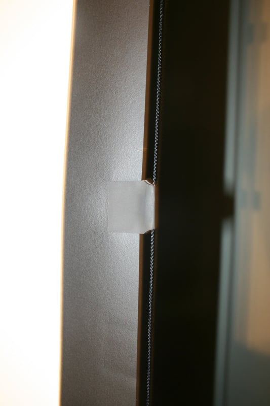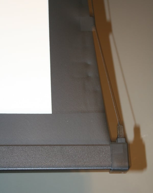 The only real downside of the Tensioned Cosmopolitan Electrol we found was that the black masking areas were not as absorptive as they could have been. With fixed screens, they use black velvet which is very non-reflective. The black borders of the Tensioned Cosmopolitan Electrol were reflective enough that we could see the "true" edges of the picture in low light. At close range you could also see indentations on the edges from where the tabs for the tensioning system overlapped when the screen was retracted.