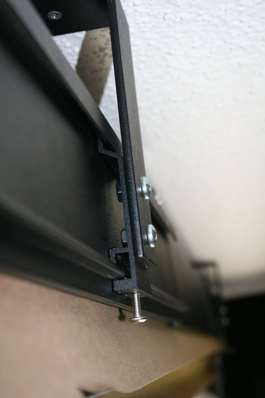 The floating bracket really made setting up the Tensioned Cosmopolitan Electrol screen a lot easier than it could have been. If we had been using the endcaps, we'd have to find at least one joist and hope to find another on the other side. With the floating mount, we just found two that we knew would hit near the middle of the mounting rails and installed them. Once we got the screen on, we were able to move it from left to right to help center it as needed. This will also be useful later as we get new projectors in for review. A projector without horizontal lens shift can be aligned to the screen by loosening the two screws on the floating mount and sliding the screen over a bit. A simple solution to an annoying problem. For normal consumers, the $84 for the floating mount is insurance for future projector purchases and makes for a really, REALLY easy install.