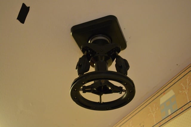 Detach the ceiling plate from the projector plate and proceed to mount the ceiling plate on the ceiling (are you tired of reading the words projector, ceiling, and plate yet?). The mount should come with 4 lag bolts, but most of the time only two are needed if they are properly centered on a ceiling joist. I never fully trust stud finders (especially on textured ceiling), so I recommend poking a small nail or precision screw driver into the ceiling to ensure you found a joist. In some instances there won’t be a joist where you want to mount the ceiling plate. In this case, you will either need to utilize lens shift or mount the plate to a block of wood that’s large enough to span the distance between two joists and secure that block to the ceiling joists (that block can go inside the ceiling if you have attic access). Once the ceiling plate is secured, install any sort of trim ring that came with the mount.