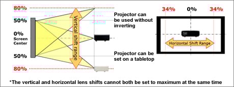 There is seldom a reason that you cannot mount the projector so it is exactly lined up with the horizontal center of the screen, and there are two big reasons you should do everything within your power to mount the projector horizontally centered on the screen. First, lens shift can degrade picture quality by subtly distorting the image. The distortion might not be very noticeable, but is still a possibility. Second, vertical and horizontal lens shift interact with each other. The more of one you use, the less of the other you can use. JVC warns consumers about this in the image below.