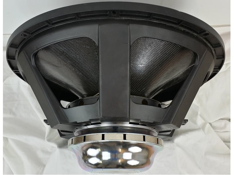 Although Reaction Audio is a relatively recent company, began in early 2014, it has already made a big splash in the world of manufacture direct speakers and subwoofers due to the high performance their products provide for their very affordable prices. Their newest offering is the Gamma 21, the least expensive ($1,799) subwoofer in our roundup by a considerable margin, but it is no weakling. The Gamma 21 sports an impressive 21” driver in a heavy-duty sealed cabinet powered by a 2,400 watt amplifier. The driver has to be considered the center-piece of the Gamma 21 with a 25 lbs. motor structure capable of 4” peak-to-peak excursion. That is a lot of air displacement, especially when you consider the size and price of the unit. The development of the driver itself took over a year, and it has the advantages of being able to play well in a smaller enclosure along with the extra sensitivity that comes with its powerful magnet and large cone diameter. The high thermal power handling of the driver's 8 layer voice coil allows the Gamma 21's beefy 2,400 watt amp to drive it to thunderous output levels.  However, like other subs in the comparison with high output amplifiers, we recommend a dedicated circuit line to get the most out of this amp.