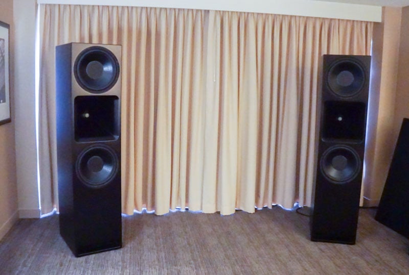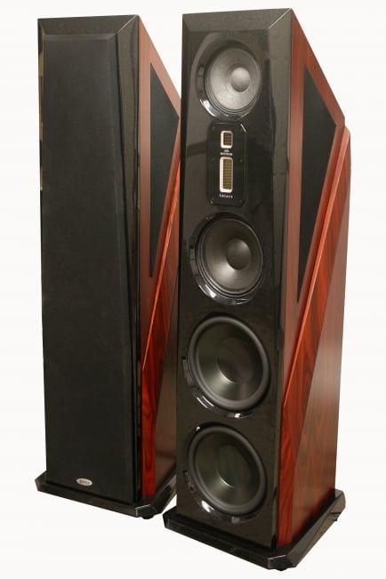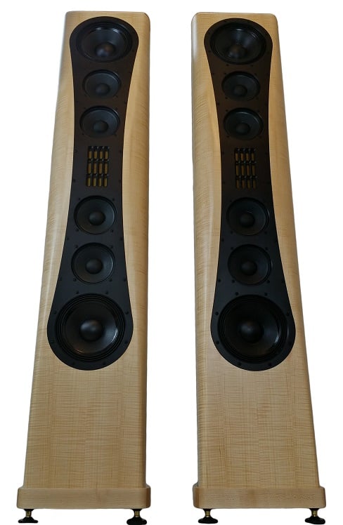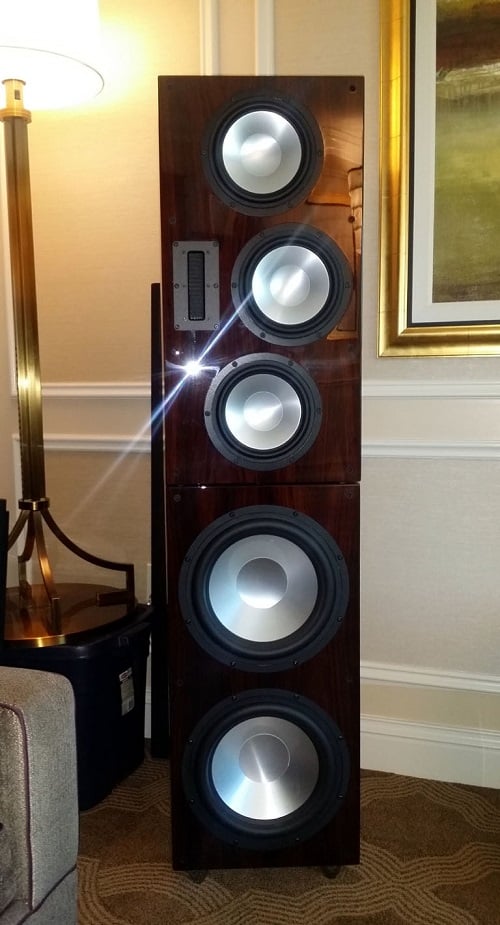 There is a lot more going on with the 215RTs than just driver overkill. The Noesis 215RTs act as a true single point source for sound, because care is taken to physically and acoustically time align all the drivers. In many speakers the varying distances of the different drivers can cause different time arrivals of the frequency bands of those drivers, which can cause a smearing of the sound and loss of intelligibility. While measures can be taken to correct for driver distance disparity, there can be no perfect solution that completely overcomes the physics of that design. The 215 addresses this problem by using a concentric driver for midrange and tweeter, where the sound from both emerge simultaneously from the throat of the horn. The makes for excellent phase coherence and perfect time alignment between the midrange driver and tweeter. The woofers use a crossover point where the sound waves are long enough for the two woofers to act as one. Unlike many other larger tower speakers, the Noesis 215RT has no minimum listening distance. The base cost of the Noesis 215RTs is $3,499/ea, with upgraded finishes available for an additional cost, so it is one of the less expensive speakers in our roundup, but at a hefty 215 lbs., it is also one of the heaviest and most opposing.