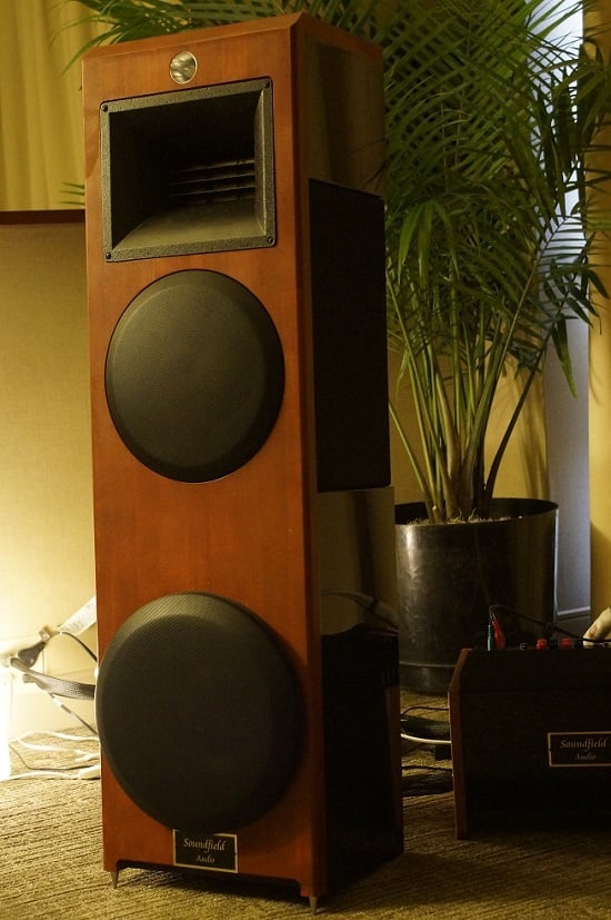 The Soundfield Audio Dipole1 speakers received high praises at their debut at the 2015 Axpona show. As the name implies, the Dipole1’s use a dipole dispersion pattern that is achieved in a couple different ways. In the lower section of the Dipole1, the bass drivers have an open rear baffle, while the upper midrange driver and tweeter on the front baffle are sealed. The dipole pattern of the front upper midrange and treble drivers are maintained by a horn-loaded planar mid-tweeter mounted on the opposite side of the front horn-loaded planar driver. The driver arrangement of the of the Dipole1’s from top to bottom with their cross-over range: a horn-loaded super-tweeter (14 kHz-28 kHz), a front-firing horn-loaded 11”x9” planar mid-tweeter (650 Hz-14 kHz), a rear-firing horn-loaded 10”x7” planar mid-tweeter (650 Hz-18 kHz), a 12” mid-woofer (60 Hz-650 Hz), a 12” subwoofer (60 Hz-14 Hz). The system is fully active with a dual 400 watt Hypex amplifiers for the mid-tweeters and mid-woofer. The subwoofer section is a 375 watt Rythmik system with adjustable volume, crossover frequency, and phase, so it can be tuned to listener’s preference. Altogether, the layout of the Dipole1 suggests an enormous amount of headroom and should be able to fill almost any size room with clear, powerful sound.