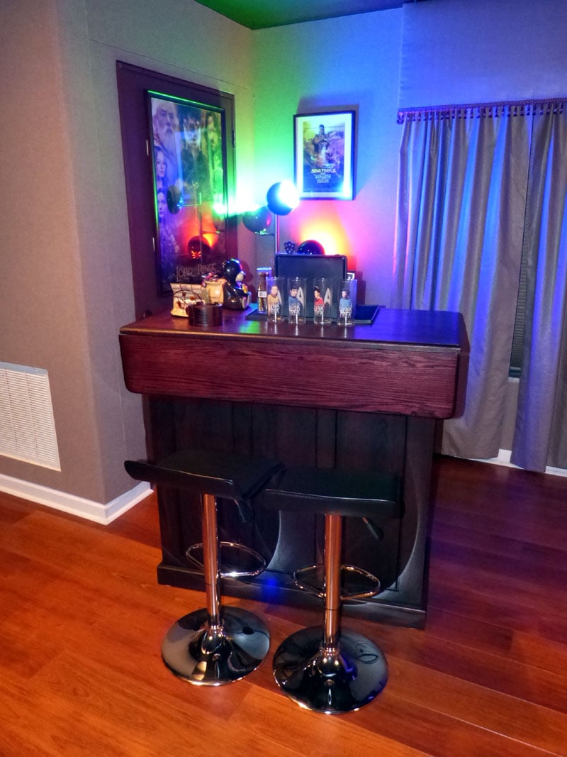 Drum Area of Audioholics Showcase Room (left); Custom made bar built by Amish (right)