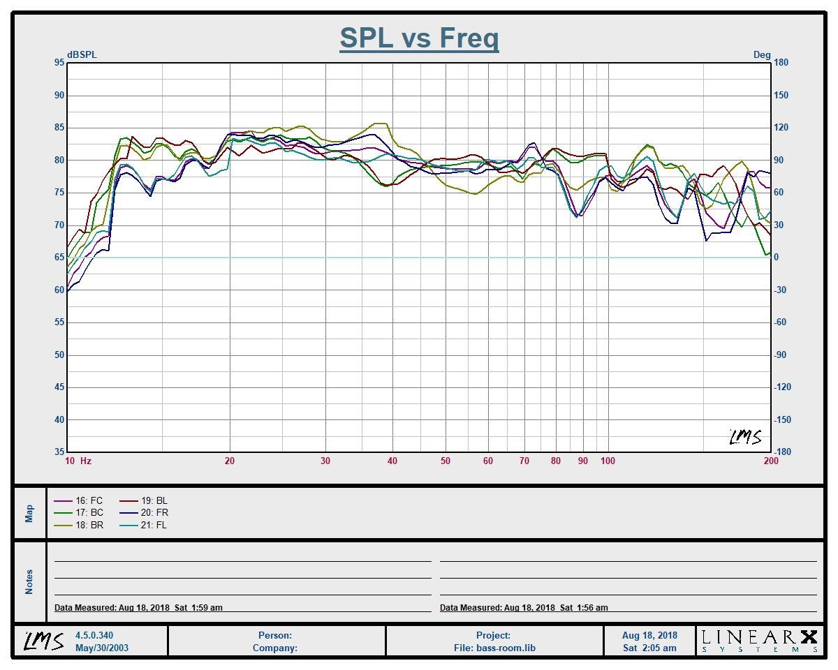 The bass response is superb at +- 5dB from 12Hz to 100Hz across all 6 seats, 2 rows of seating and this is just with a little tweaking of the manual PEQ built into the Yamaha CX-A5100 along with 5 subwoofers in the system (recently added an RBH SI-1010i in-wall sub behind 2nd row). You can read more about how this was achieved: Bass Optimization & Multi-Sub