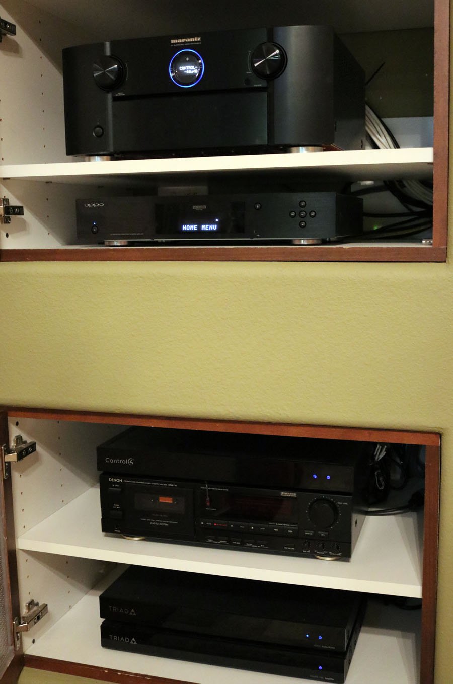 We built custom in-wall shelves to house the A/V equipment as you can see the Marantz SR8012, Oppo UDP-203, Control4 EA5, Triad TS-AMS8 8CH Audio Matrix and 16CH TS-Pamp-100 amplifier, 2 Furman Elite-15 DMi and Elite-20 PFi power conditioners, Motorola FIOS HD DVR, Denon 3-head Tape deck, JVS SVHS, and Nintendo Wii. The downside to integrating all of your equipment into a customized in-wall rack is difficult access. Should you decide on doing this, we highly recommend you create an access point behind the equipment. I had a friend do just that where his in-wall rack backed directly into his bedroom closet. This is the way it should be done if you have that luxury.