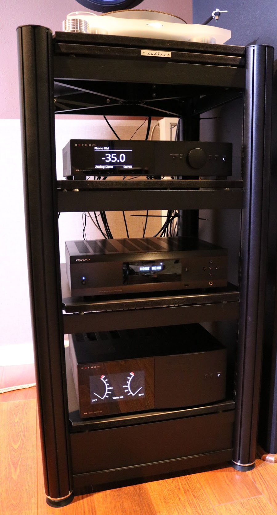 The secondary rack is an Audiav Crystal which is elegant and also extremely sturdy; capable of holding the heaviest gear the industry has to offer. In this rack, resides the Marantz TT-15S1 turntable, Anthem STR Preamp,and STR power amplifier, and Oppo UDP-205 UHD Universal player. The Oppo UDP-205 is used in the primary theater system to play UHD Blu-rays and stream video content from my network computer. The balanced outputs of the UPD-205 are utilized for critical two-channel listening of SACD's and high resolution streaming from my network drive for the Anthem two-channel system.