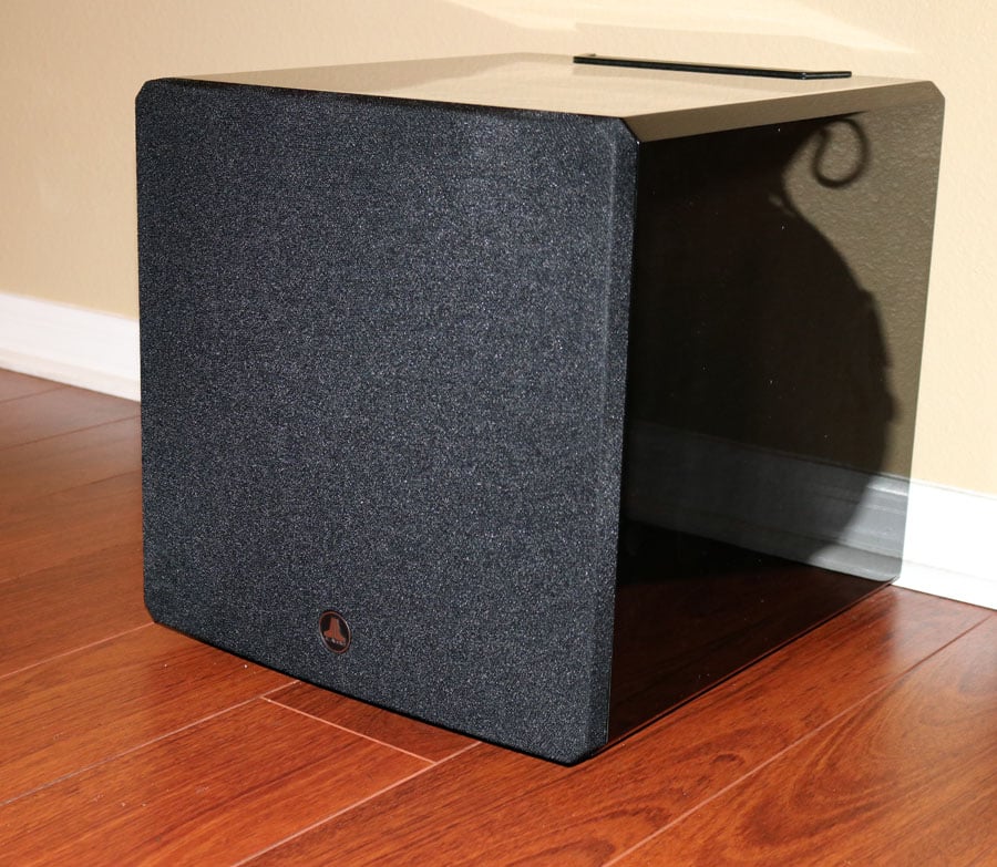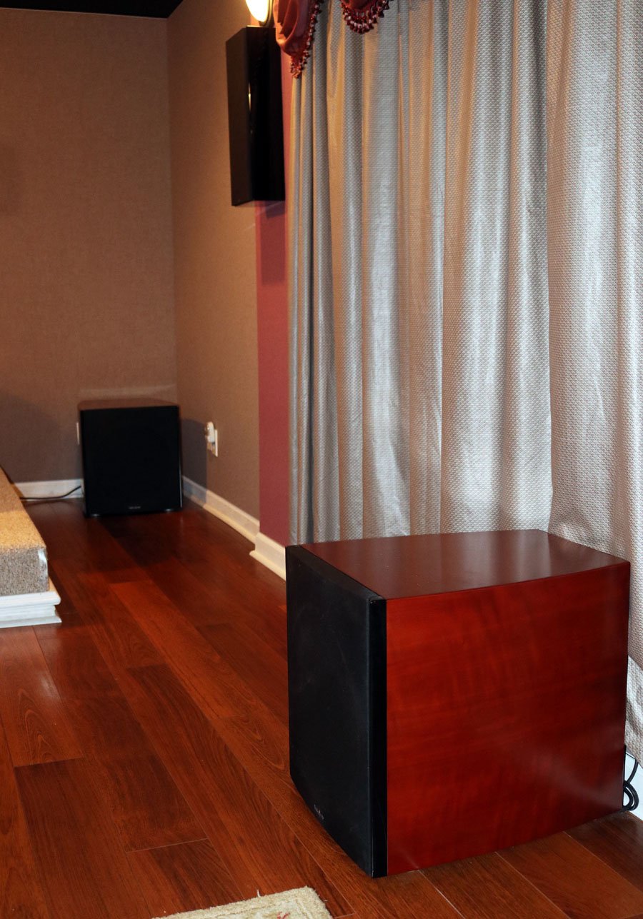 JL Audio e112 sub tucked behind left couch ; 2nd JL Audio e112 sub back right wall