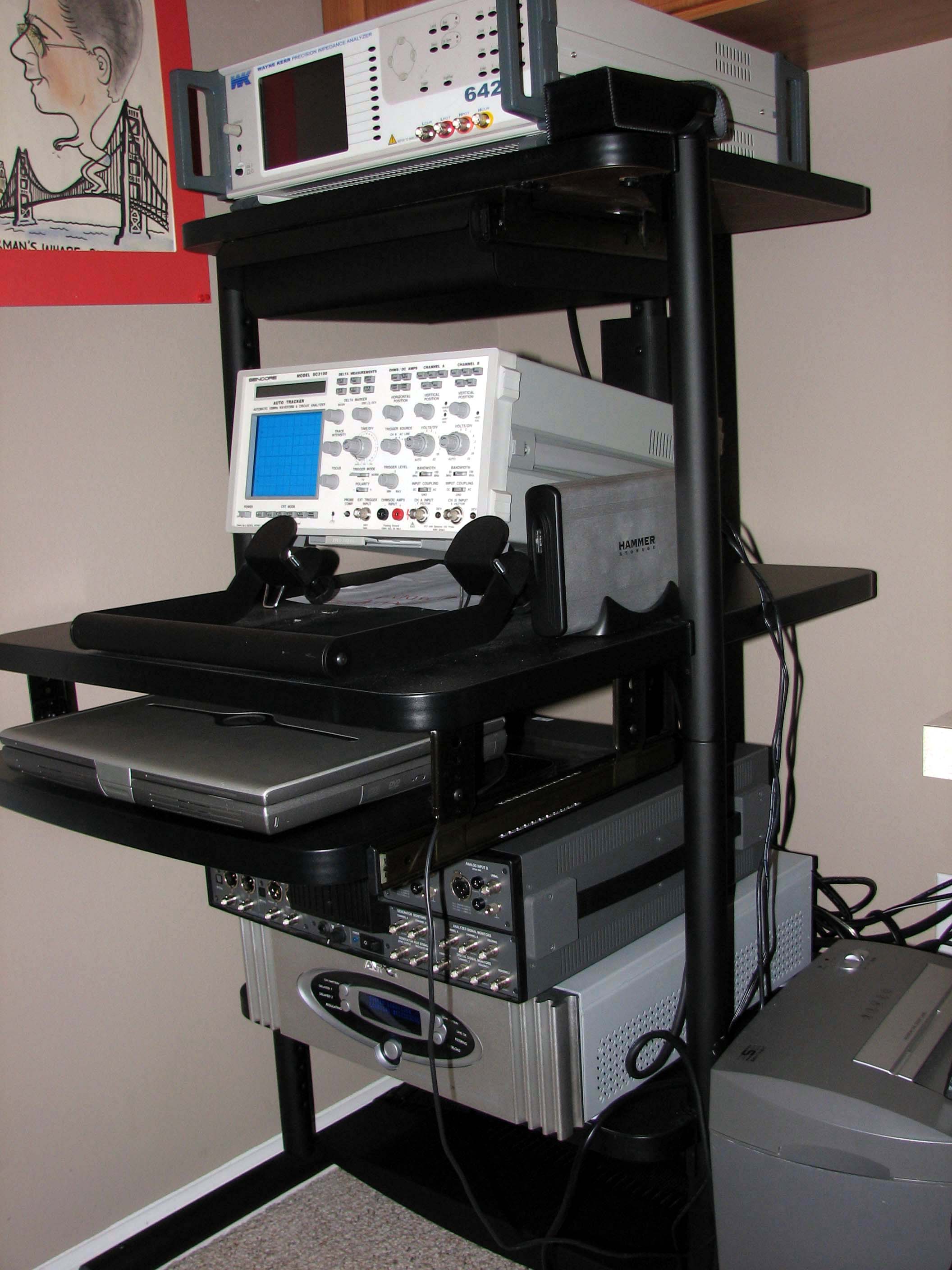 A separate test lab was created in the theater room which has 6 COAX and Ethernet connections tied directly into the main theater room. When we do high SPL testing of loudspeakers, we typically setup the test equipment in the theater room, and run like hell into the test lab, slamming the door shut before the first sweep blows us out of the room.