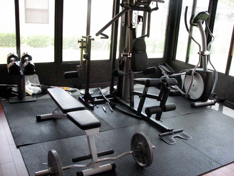 Paradigm SA-25 In-wall Speakers(left); workout room (center); NHT 02-ARC Speakers (right)